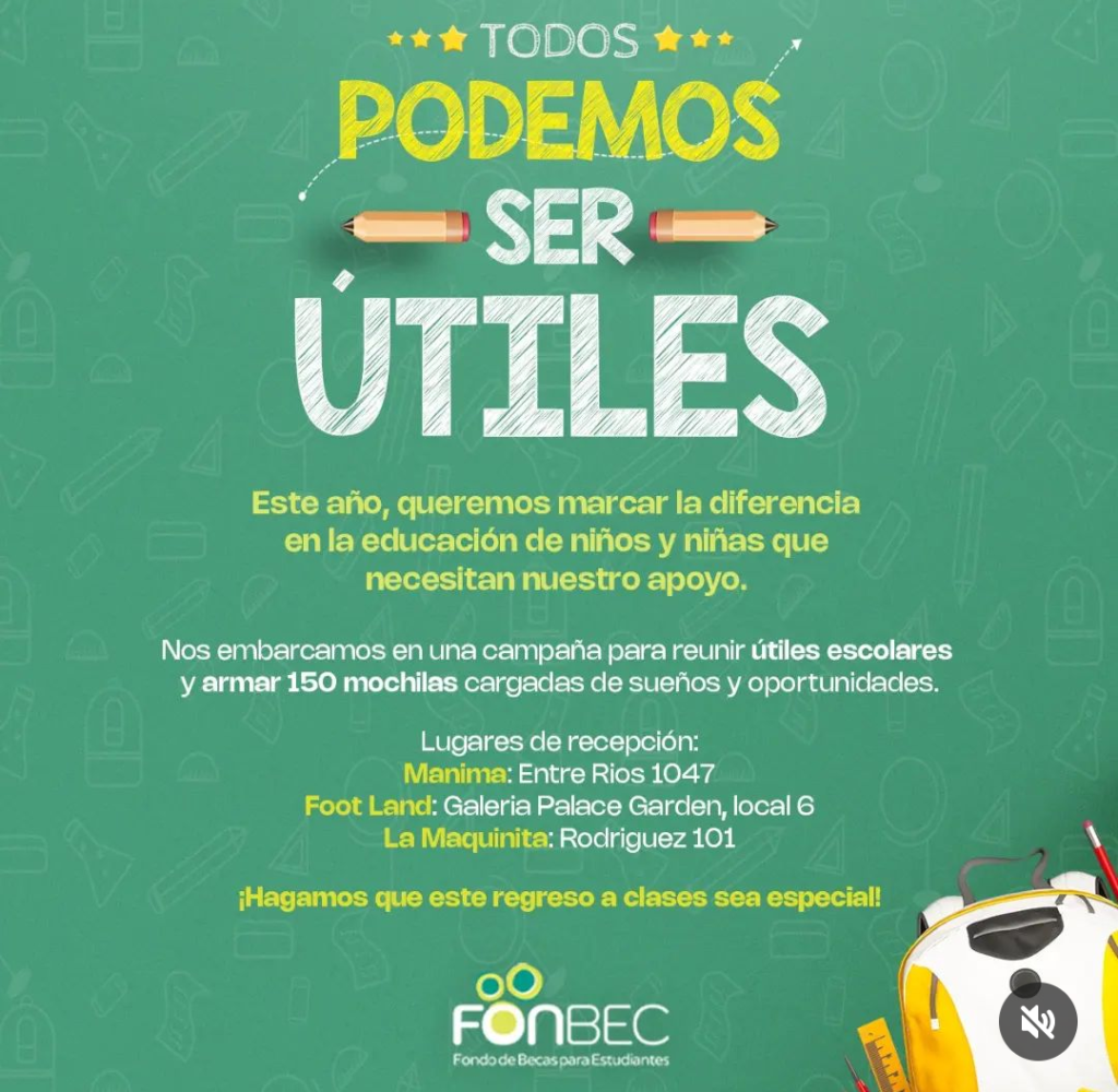 «Todos podemos ser útiles», no te quedés afuera, ponete de acuerdo con compañeros de trabajo o estudio, con familiares o amigos y con un poquito de dinero que aporte cada uno se puede hacer una compra que va a significar una gran ayuda y va a generar que un niño pueda asistir a su primer día de clase con los elementos necesarios. En el afiche que se publica a continuación están los lugares de recepción de útiles, si no podes llevarlo personalmente no dudes en comunicarte con Fonbec a través de las redes @fonbecrosario y algún colaborador pasará a reitarlos.