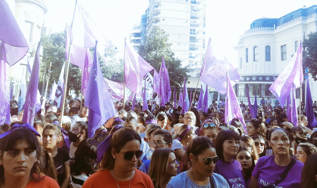 Miles de personas, la mayoría mujeres que reivindican sus derechos marchan esta tarde en Rosario en el Día de la Mujer.